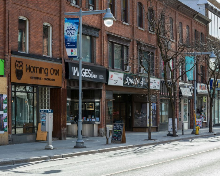 Con đường Bank Street vắng tanh giữa trung tâm thành phố Ottawa, Canada.