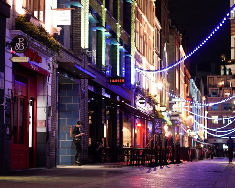 Một nhân viên lặng người hút thuốc giữa khung cảnh vắng vẻ bên ngoài một nhà hàng ở London, Anh.