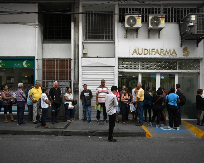 Dòng người xếp hàng bên ngoài một hiệu thuốc ở Buga, Valle del Cauca, Colombia.