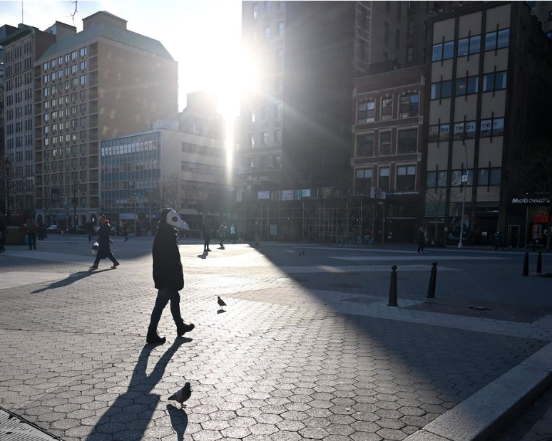 Một người đàn ông đeo khẩu trang tản bộ tại Quảng trường Union ở Manhattan, thành phố New York, Mỹ. Dịch bệnh lan rộng với tốc độ chóng mặt chỉ trong thời gian ngắn khiến người dân nước này sợ hãi việc ra đường, phố xá tấp nập ngày trước giờ trở nên đìu hiu.