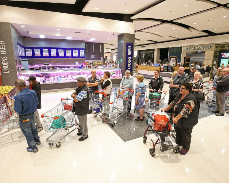 Khách hàng chờ đợi siêu thị Coles mở cửa ở Melbourne, Australia. Coles đã quyết định mở cửa sớm một tiếng đồng hồ để tạo điều kiện cho các cụ già và người khuyết tật có cơ hội mua nhu yếu phẩm, trong bối cảnh mọi người đang đổ xô càn quét các siêu thị để tích trữ hàng phòng COVID-19.