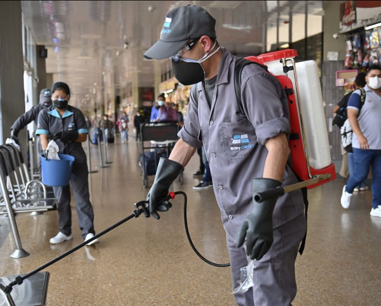 Một nhân viên đang khử trùng nhà chờ xe bus tại Bogota, Colombia.