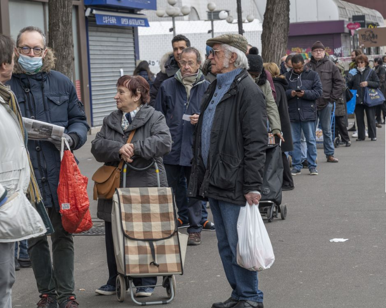 Dòng người xếp hàng ở cửa siêu thị tại Paris (Pháp), tranh thủ mua sắm nhu yếu phẩm trước khi lệnh phong tỏa được áp dụng hôm 17/3.