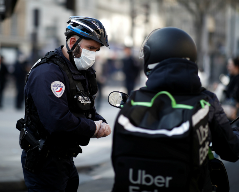 Một cảnh sát đang kiểm tra người điều khiển xe máy ở khu phố Belleville, thành phố Paris, Pháp. Nước này đã áp dụng lệnh phong tỏa thủ đô để ngăn chặn sự lây lan của virus từ trưa ngày 16/3.