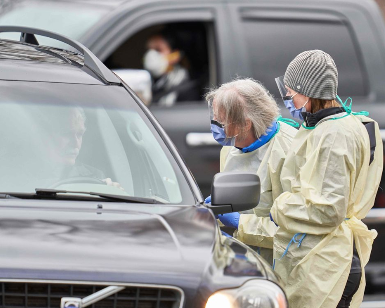 Nhân viên y tế trò chuyện với bệnh nhân tại một trung tâm xét nghiệm COVID-19 ở thành phố London, bang Ontario, Canada hôm 17/3.
