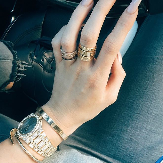 Jenner thích đeo khá nhiều nhẫn, vòng và đồng hồ. Những món trang sức cô thường dùng có thể kể đến như chiếc nhẫn vàng hồng Shay Fine Jewelry giá 7.000 USD, loạt nhẫn One Love giá 8.800 USD mỗi chiếc, sáu chiếc vòng Cartier Love giá 5.000 USD mỗi chiếc, đồng hồ Rolex Pearlmaster 34 giá hơn 53.000 USD.
