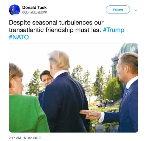 Ông Tusk đăng bức ảnh gây tranh cãi trên sau khi Thủ tướng Canada Justin Trudeau bị bắt gặp cùng lãnh đạo Anh, Pháp và Hà Lan bình phẩm về Trump trong một cuộc gặp bên lề Thượng đỉnh NATO diễn ra ở London vừa qua.