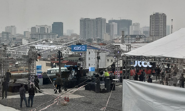 Mạng xã hội Việt Nam ngày hôm qua lan truyền những bức ảnh chụp trường quay ngoài trời của nhiều đài truyền hình Hàn Quốc dựng trên nóc các tòa nhà cao tầng ở Hà Nội. Trong bản tin thời sự phát tại Hàn Quốc, người ta thấy toàn cảnh thủ đô của Việt Nam hiện lên sống động phía sau người dẫn chương trình.