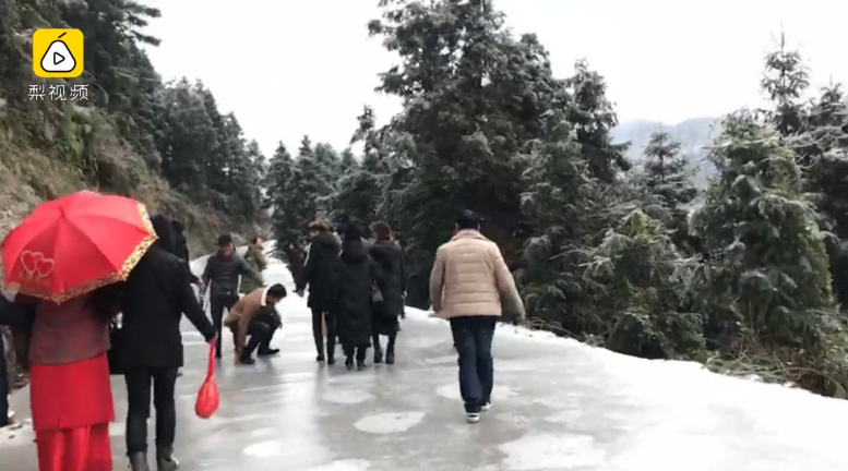 Cụ thể, do cả nhà cô dâu lẫn chú rể đều ở trên núi, nơi có đường đi rất dốc. Việc di chuyển càng trở nên khó khăn hơn khi những tuyến đường đều bị băng phủ kín, xe ôtô cũng không thể đi được. Vì vậy, đoàn đưa dâu gồm khoảng 30 người đã quyết định xuống xe để đi bộ. Nhưng khi bước xuống, người trong đoàn đều trượt ngã vì đường quá trơn. Trong chốc lát, đám rước dâu biến thành một buổi… lễ trượt băng.