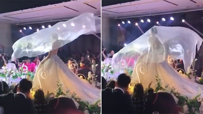 Theo một nhân chứng cho biết, khi đám cưới sắp kết thúc, để buổi lễ thêm phần sinh động, các nhân viên chịu trách nhiệm đám cưới đã tới hôn trường để tạo ra “tấm khăn voan biết bay”. Theo đó, “khăn voan bay” đang là một cơn sốt ở Trung Quốc, sau lần đầu tiên xuất hiện trên mạng xã hội trong một đám cưới ở Thượng Hải vào cuối năm ngoái.