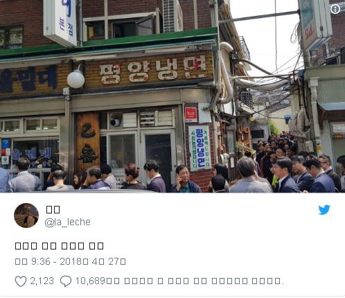 Một người đàn ông 42 tuổi tên Park cho hay, anh và hai đồng nghiệp khác bất ngờ quyết định đi ăn mì lạnh Bình Nhưỡng sau khi họ xem buổi tường thuật trực tiếp hội nghị thượng đỉnh cấp cao Hàn - Triều ở văn phòng. Ảnh: Twitter