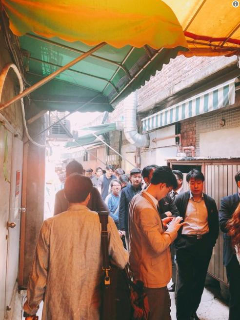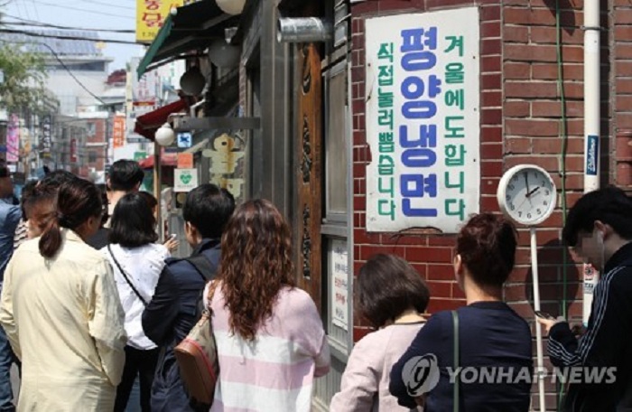 Một hàng dài hơn 20 thực khách đứng xếp hàng trước Pildong Myeonok, một quán bán naengmyeon nổi tiếng ở trung tâm Seoul.Nhân viên làm việc tại nhà hàng nói: “Nhờ cuộc thượng đỉnh giữa hai nhà lãnh đạo, quán ăn của chúng tôi hôm nay mới đông khách như vậy. Số lượng người đến thưởng thức món mì lạnh trưa nay cũng gần bằng thời điểm giữa mùa hè”. Ảnh: Herald Business