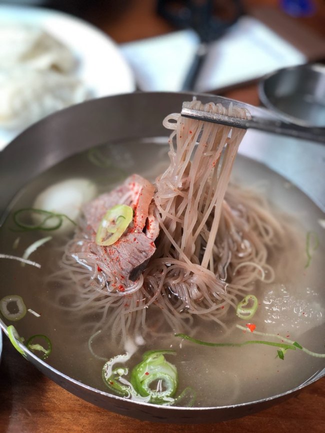 Những quán naengmyeon tại thủ đô Hàn Quốc động nghịt thực khách chờ được thưởng thức món ăn đặc biệt này. Bãi đậu xe của Bongpiyang, một nhà hàng mì lạnh Bình Nhưỡng nổi tiếng ở phía đông Seoul cũng kín chỗ vì khách hàng đổ xô đến ăn trưa. “Nhiều xe ô tô vẫn tiếp tục đến mặc dù chúng tôi không còn chỗ để nữa”, một nhân viên của Bongpiyang nói. Ảnh: Twitter