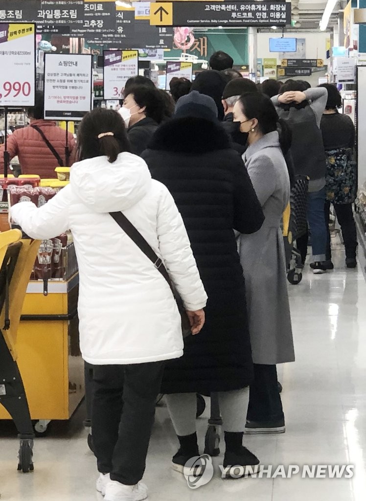 Không chỉ ở Daegu, người dân cũng đổ xô tới siêu thị và các hiệu thuốc lớn để mua khẩu trang và nước diệt khuẩn. Hình ảnh cho thấy hàng trăm người xếp hàng trước các cửa hiệu E-Mart ở thành phố Daegu từ 8h sáng.