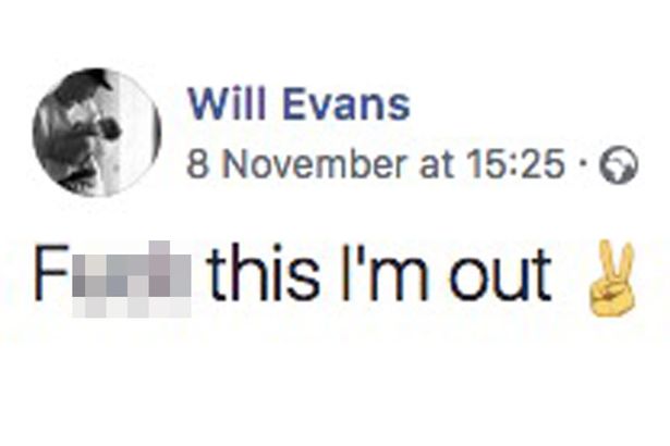 Sáng 8/11, Will Evans, khoảng 20 tuổi, đăng tải một dòng trạng thái với nội dung: “Hóa ra người mà bạn coi là bạn gái bấy lâu nay lại chẳng là gì với cô ấy”. Chiều cùng ngày, Will tiếp tục có thêm dòng trạng thái: “Khốn kiếp, đi chết luôn cho rồi!”. Tuy nhiên, chỉ chưa đầy một tiếng sau, người ta tìm thấy thi thể anh ở Malvern, hạt Worcestershire vì lên cơn đau tim.