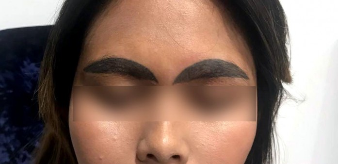 Đôi lông mày như 2 con đỉa trâu của Kanyarat sau khi xăm hỏng. Ảnh: Asiaone