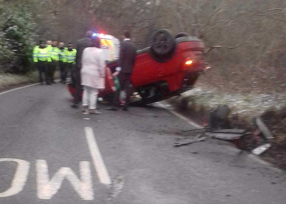 Chiếc xe cưới bị trượt tuyết và lật ngược. Ảnh: The Sun
