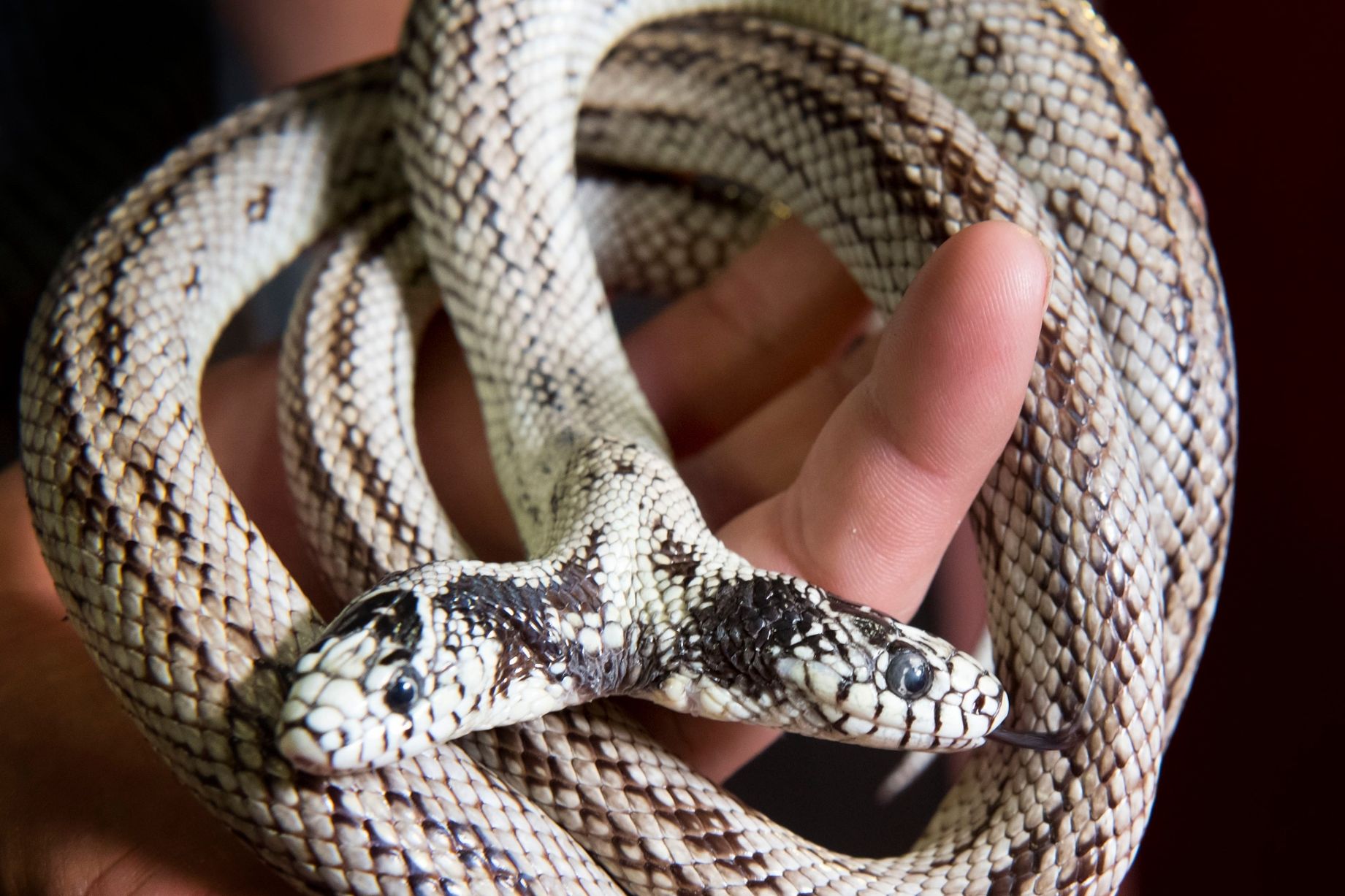 Đây là một con rắn vua hai đầu 17 tuổi ở California, Mỹ có tên là Tom và Jerry. Con vật được trưng bày trong triển lãm 'Reptiles Expo' ở Villeneuve, Thụy Sĩ, vào tháng 12/2018.