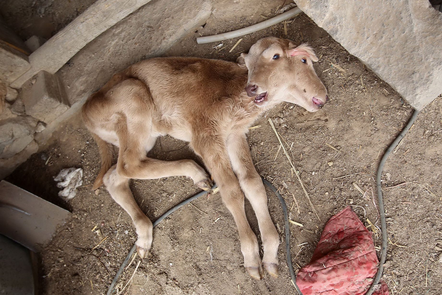 Năm 2011, một nông dân ở phía bắc tỉnh Hà Bắc, Trung Quốc đã bị sốc khi con bò của anh ta sinh ra một con bê hai đầu. Mẹ của con bê bất thường trước đó sinh những con bê khỏe mạnh bình thường. Cả 2 đầu con bê đã hình thành đầy đủ với 2 mắt, mũi và miệng. Con bê không thể đứng và người nuôi phải cho nó ăn bởi nó không thể bú mẹ.