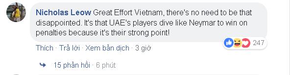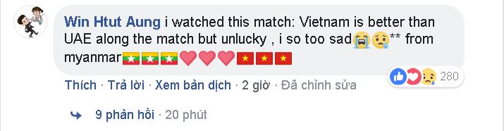 “Tôi đã xem trận đấu này. Việt Nam chơi tốt hơn UAE suốt trận nhưng thiếu may mắn. Tôi cảm thấy rất buồn”, một cư dân mạng từ Myanmar bình luận.