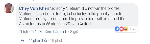 “Thật đáng tiếc vì Việt Nam không giành được huy chương đồng! Việt Nam đá hay hơn hẳn nhưng thiếu may mắn ở những loạt sút penalty. Đội tuyển Việt Nam là người hùng trong lòng tôi, mong rằng họ sẽ được thi đấu tại World Cup 2022 ở Qatar”.