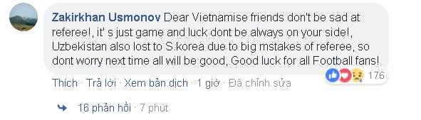 “Những người bạn Việt Nam, đừng buồn vì trọng tài nhé! Đó chỉ là một trận đấu khi mà may mắn không nằm ở phía các bạn mà thôi. Tuyển Uzbekistan cũng đã thua Hàn Quốc chỉ vì những sai lầm nghiêm trọng của trọng tài đấy. Vậy nên đừng lo, điều tốt đẹp còn ở phía trước”.
