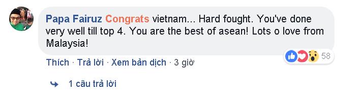 “Chúc mừng Việt Nam… Các bạn đã thi đấu kiên cường. Đội tuyển đã làm rất tốt khi lọt vào top 4 (đội mạnh nhất châu Á). Các bạn là đội tuyển tuyệt nhất trong số các nước ASEAN”.