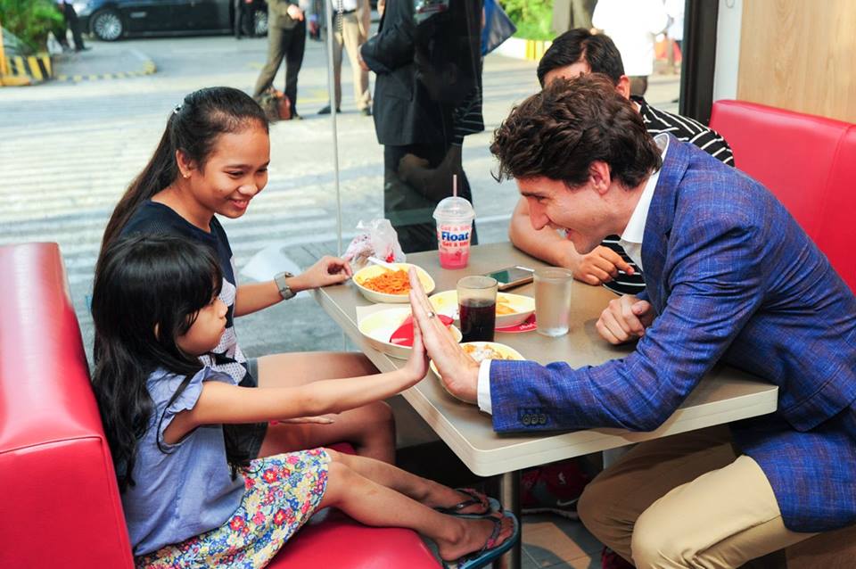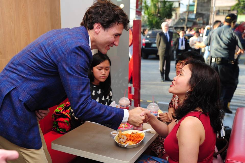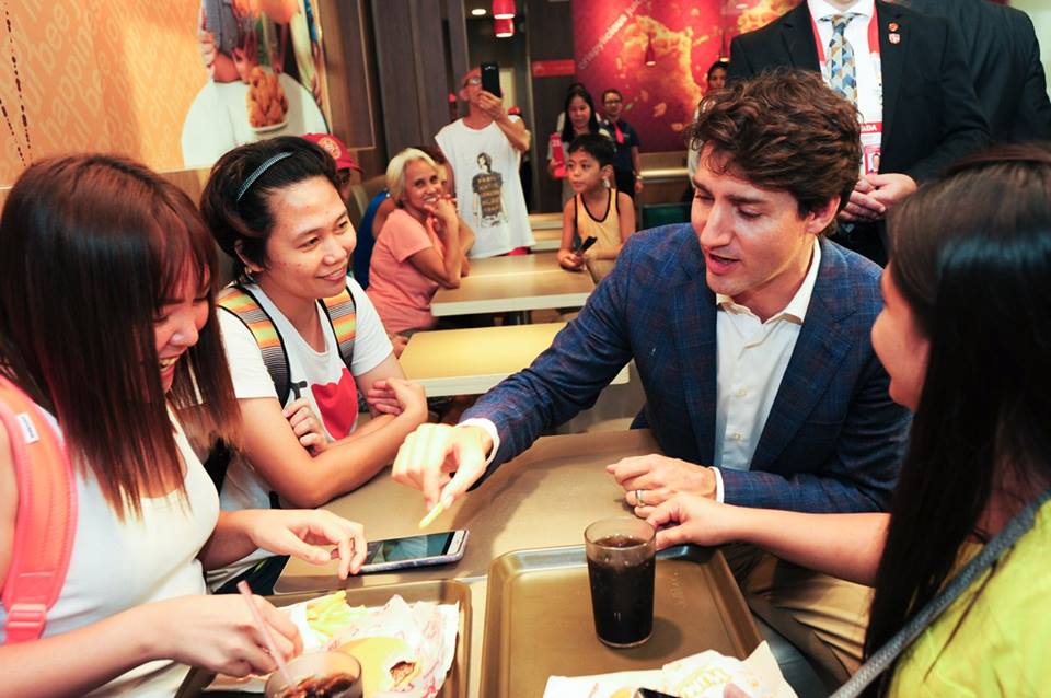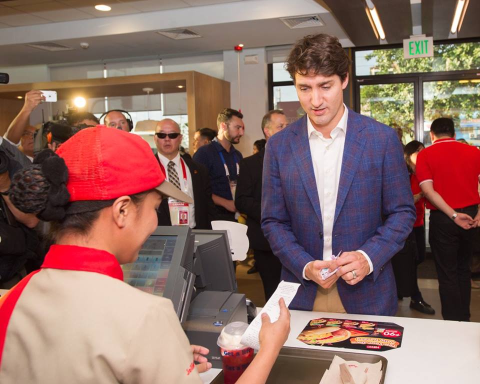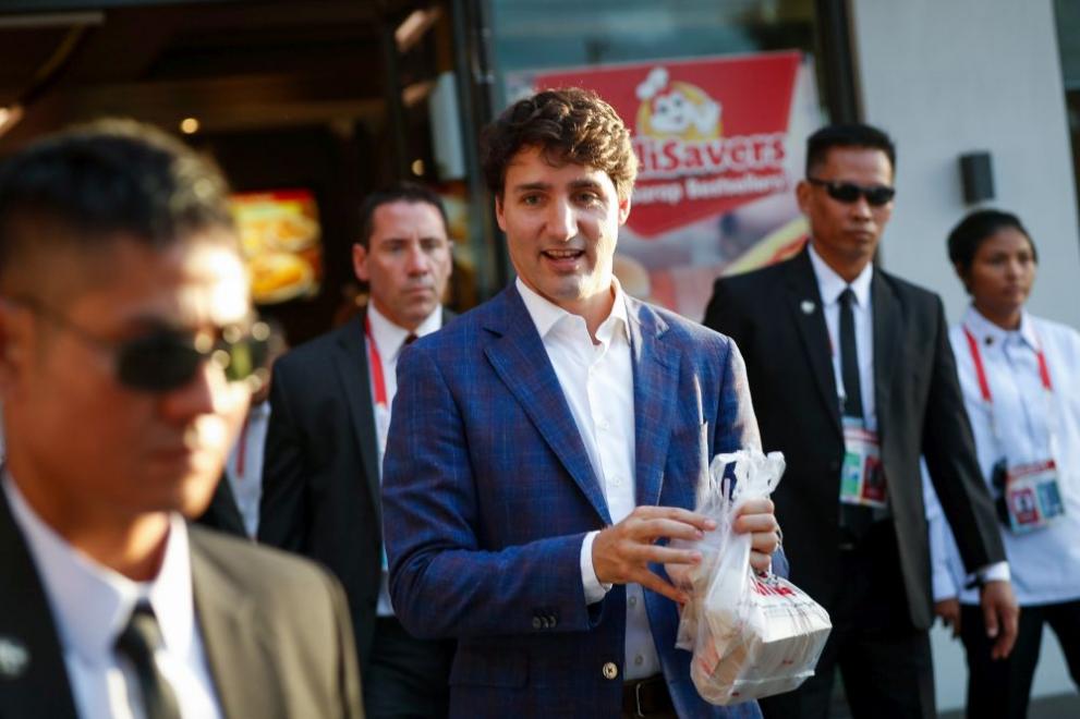 Không lâu sau khi đến sân bay Clark ở Manila, Philippines, chiều 12/11, Thủ tướng Jusin bất ngờ đến một cửa hàng bán đồ ăn nhanh.