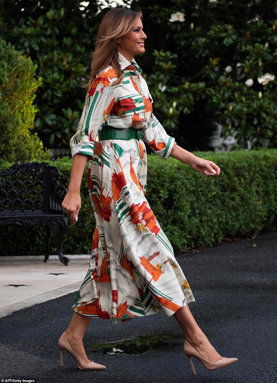 Chiếc váy dáng sơ mi dài tới bắp chân của bà Melania được thắt eo bằng chiếc thắt lưng màu xanh lá cây. Bà đi giày mũi nhọn màu be hài hòa với cả bộ váy.