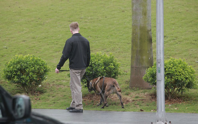 Mật vụ Mỹ dẫn chó nghiệp vụ đi tuần tra quanh khách sạn Marriott.