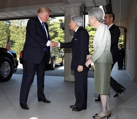 Ngày 6.11, Tổng thống Mỹ Donald Trump đã có cuộc hội kiến Nhật hoàng Akihito và phu nhân Michiko tại thủ đô Tokyo, Nhật Bản. Tờ Daily Mail của Anh đã đăng bức ảnh so sánh thú vị hành động của người tiền nhiệm Barack Obama và đương kim Tổng thống Donald Trump khi cùng gặp một người.