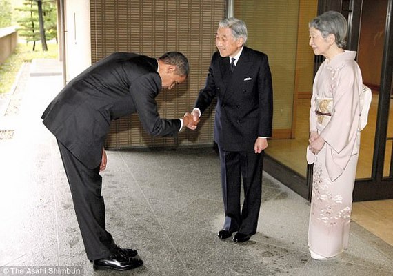 Cách đây 8 năm, ông Obama cũng gặp Nhật hoàng và Tổng thống Mỹ khi đó cúi người khá nhiều. Trái lại, ông Trump bắt tay Nhật hoàng và không hề cúi đầu. Trong văn hóa của người Nhật Bản, cúi đầu là điều thường thấy khi người có thứ bậc thấp hơn chào người bề trên.