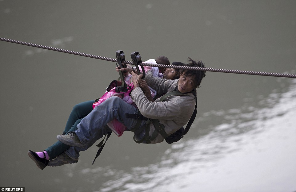 Video: Người dân Trung Quốc đu dây, vượt dòng sông dữ.