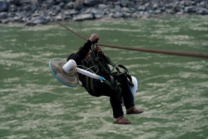 Một người đàn ông mang theo quạt, treo lơ lửng trên dây đu giữa dòng sông dữ.