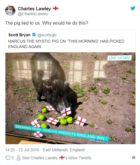 Vào buổi sáng trước khi đội Tam sư quyết đấu với tuyển Croatia tại chung kết World Cup, chương trình This Morning của Anh đã chiếu cảnh chú lợn tiên tri nổi tiếng Marcus dự đoán tuyển Anh sẽ đả bại Croatia và giành tấm vé bước vào vòng chung kết. Tuy nhiên, kết quả lại trái ngược hoàn toàn khi Anh thua Croatia với tỷ số 1-2.