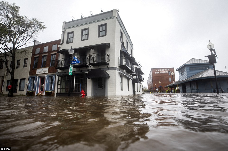 Nước dâng cao khắp các tuyến đường ở Wilmington, bang North Carolina hôm 14/9. Tính đến 8 giờ tối 14/9 (giờ địa phương), Florence bị hạ cấp, chỉ còn là một cơn bão nhiệt đới với sức gió 113 km/h, thậm chí có lúc lên tới 169 km/h. Florence đã gây mưa lớn ở các bang South và North Carolina dẫn tới ngập ở các khu vực dân cư. Ảnh: EPA