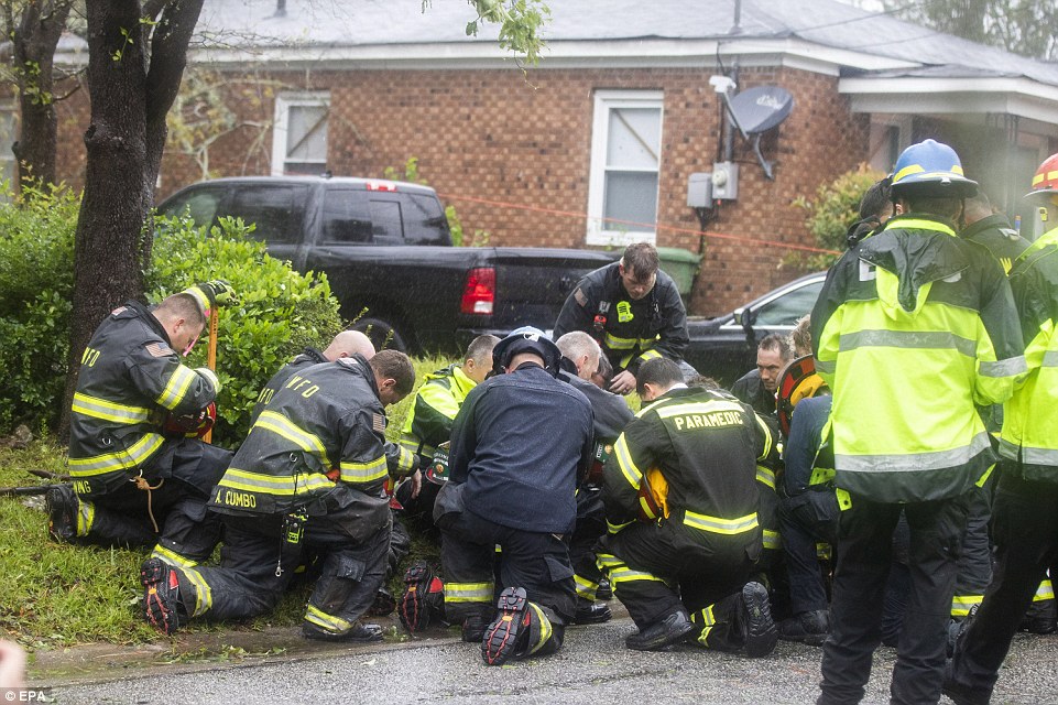 Lính cứu hỏa chỉ còn biết cầu nguyện cho các nạn nhân. Ngoài trường hợp của Lesha Murphy-Johnson, còn 4 người khác được xác định đã thiệt mạng trong bão Florence. Một người phụ nữ ở Hampstead qua đời khi lên cơn đau tim mà không thể gọi trợ giúp y tế. Tại Kinston, thêm hai trường hợp tử vong nữa. Một người đàn ông 78 tuổi bị điện giật trong khi cố gắng kết nối dây nối máy phát điện trong mưa, và một người đàn ông 77 tuổi chết bên ngoài nhà riêng, có thể do bị gió thổi bay khi đang kiểm tra những con chó cưng. Ảnh: EPA
