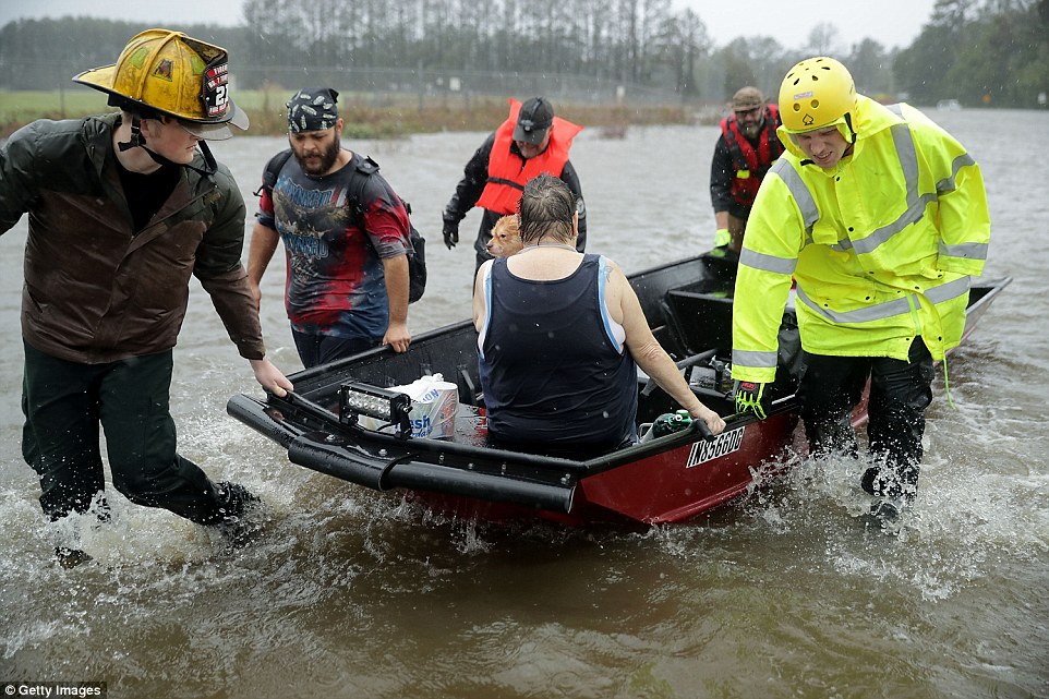 Nhân viên cứu hộ từ Sở Cứu hỏa số 7 ở Thành phố James, bang North Carolina và các tình nguyện viên từ Nhóm Ứng phó Khủng hoảng Dân sự dùng thuyền đưa một phụ nữ và con chó cưng của bà ra khỏi căn nhà bị ngập. Ảnh: Getty