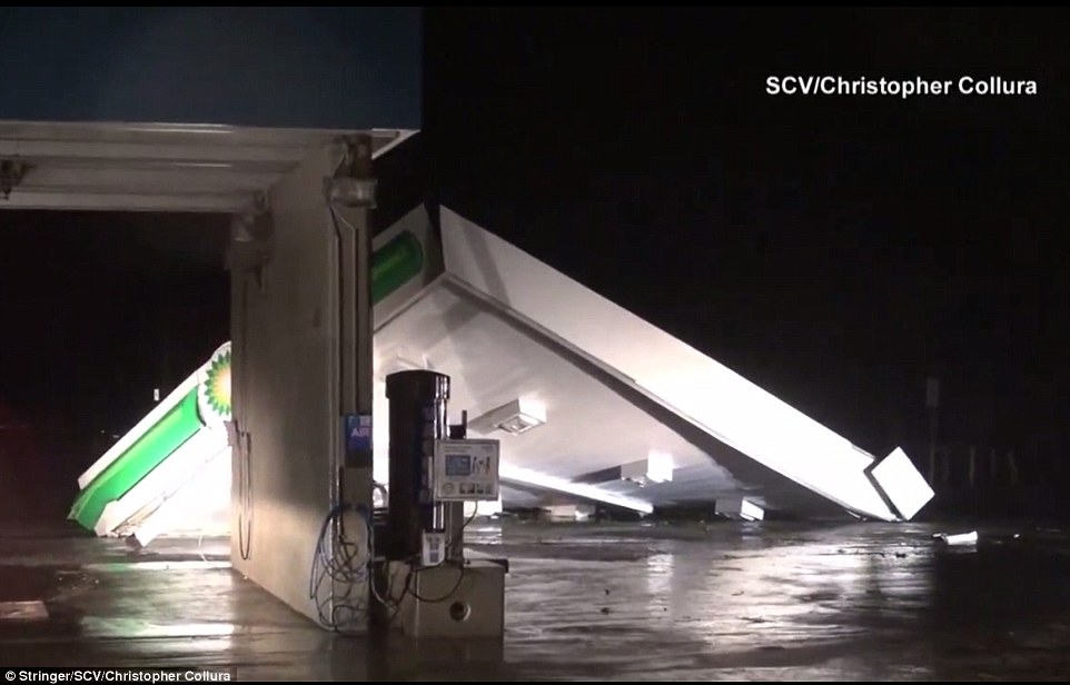 Mái hiên của một trạm xăng BP ở Top Sall, North Carolina, bị thổi bay khi cơn bão Florence đổ bộ trong đêm 13/9. Ảnh: Stringer
