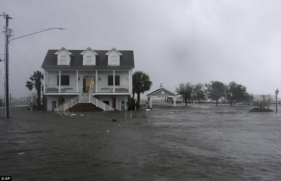 Nước bao quanh một ngôi nhà khi cơn bão Florence đổ bộ Swansboro.Hầu hết người dân trong các ngôi nhà ở những khu vực bị ảnh hưởng được sơ tán đi nơi khác. Ảnh: AP
