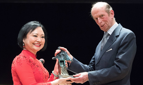 Bà Kim Phúc (trái) nhận giải thưởng Dresden Hòa Bình tại tòa nhà Semperoper ở thành phố Dresden, Đức. Ảnh: AFP.