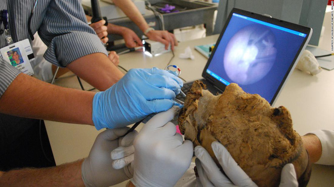 Các chuyên gia tiến hành chiết xuất ADN từ phần đầu của xác ướp bí ẩn. Ảnh: Museum of Fine Arts, Boston