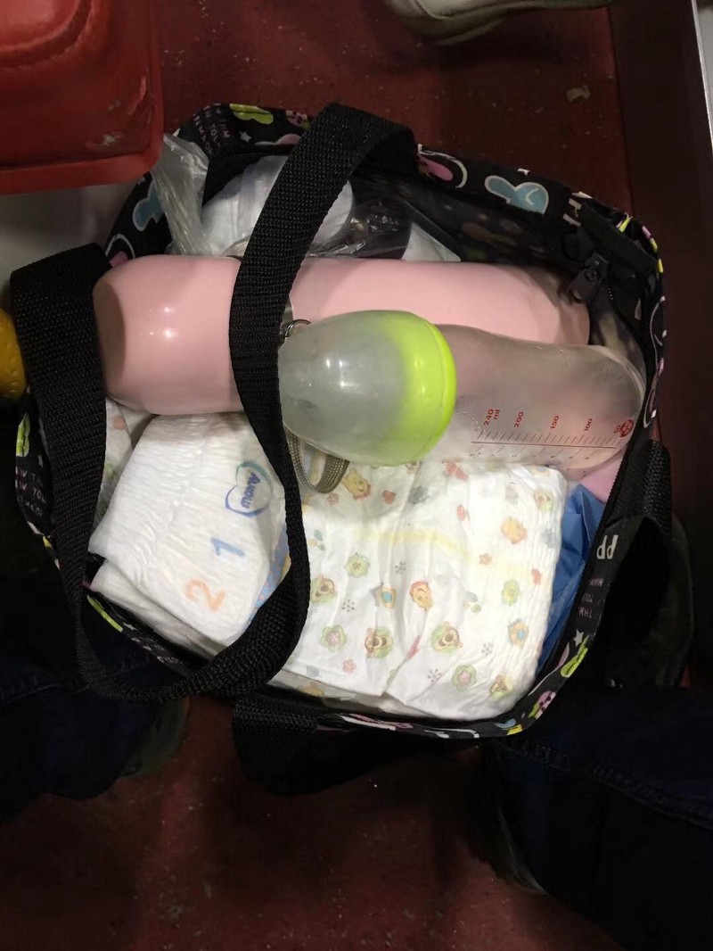 Bố mẹ bé gái để lại một balo đựng đầy bỉm, sữa bột,…