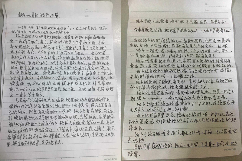 Mở đầu bức tâm thư, bố mẹ cô bé viết: “Làm ơn hãy đưa cô bé tới đồn cảnh sát”. Bức thư còn ghi rõ bé gái 6 tháng tuổi mắc chứng bệnh động kinh, gia đình không đủ khả năng tài chính để chữa bệnh cho con. Họ cũng viết cách chăm sóc đứa trẻ và các loại thuốc, giờ giấc uống thuốc và liều lượng một cách cụ thể.