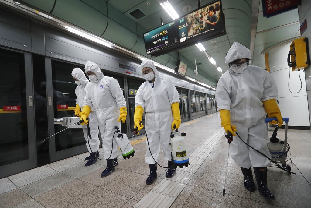 Nhân viên khử trùng tại một ga tàu ở Hàn Quốc. Ảnh: AP