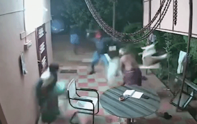 Cặp vợ chồng già cầm ghế nhựa đánh đuổi nhóm cướp cầm dao rựa.