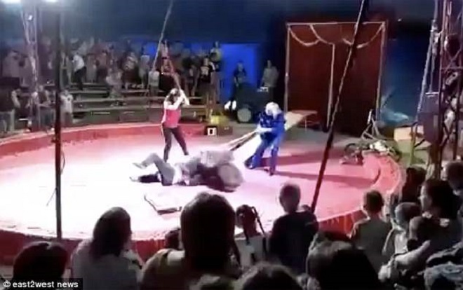 Sau đó, một nhân viên nam của gánh xiếc đã liên tục quất roi vào chú gấu, nhưng điều này còn khiến chú gấu trở nên giận dữ hơn và đẩy anh ngã xuống sàn. Cuối cùng, đã có 2 người huấn luyện khác giữ được chân chú gấu và kéo ra ngoài khu vực.