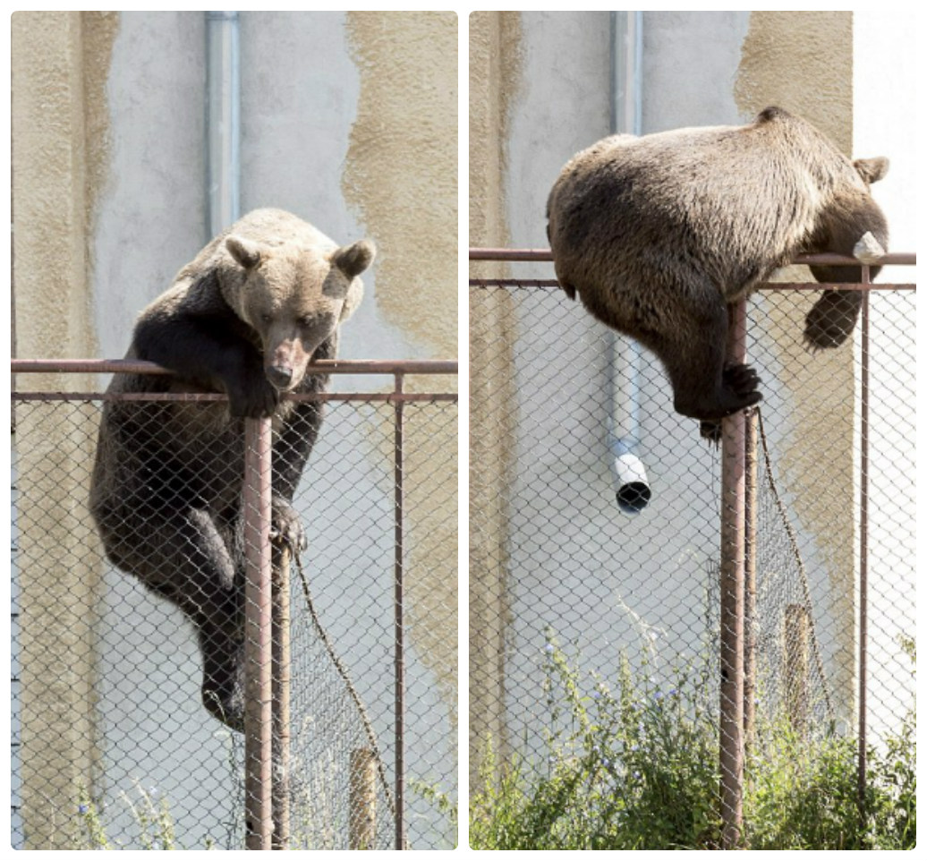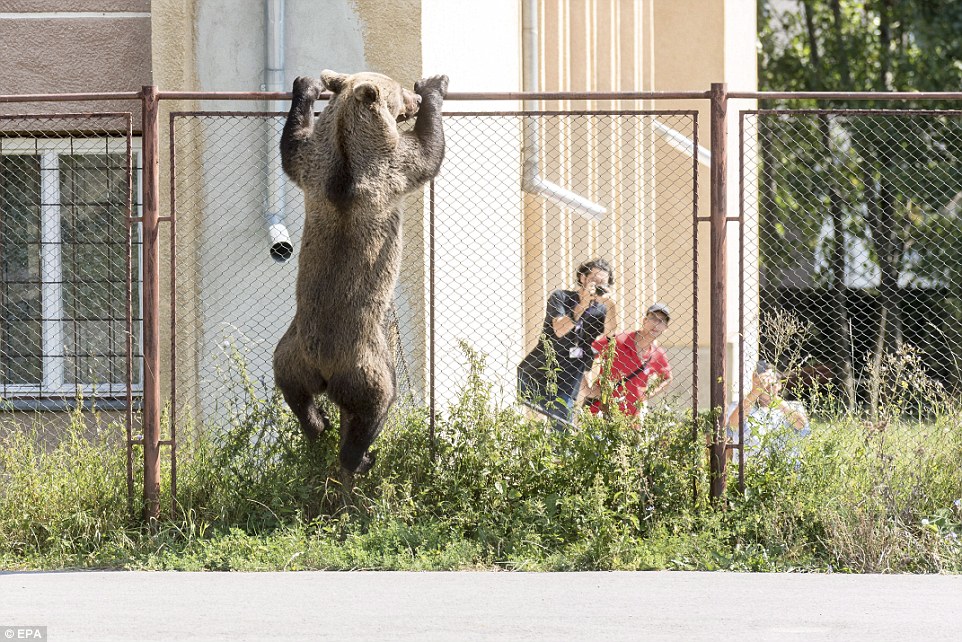 Con gấu nâu trèo lên hàng rào vào sân một trường trung học ở ở Transylvania, thành phố Miercurea Ciuc sau khi bị người dân địa phương đuổi theo vào khoảng 6h ngày 21/8..