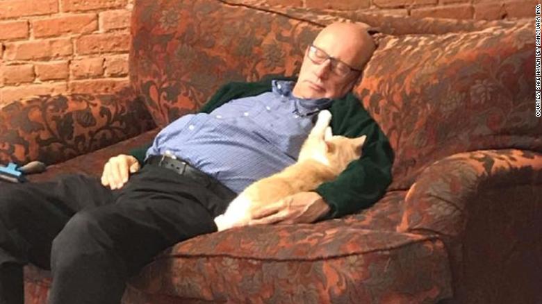 Công việc của ông Terry Laurmen là hàng ngày đến đây để chải lông và ôm ấp những chú mèo. Ảnh: CNN