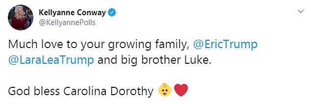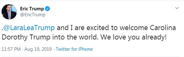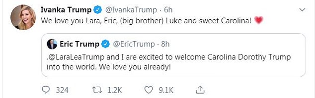 “Gửi tình yêu và lời chúc phúc đến @EricTrump @LaraLeaTrump và anh lớn Luke. Chúa phù hộ Carolina Dorothy”.